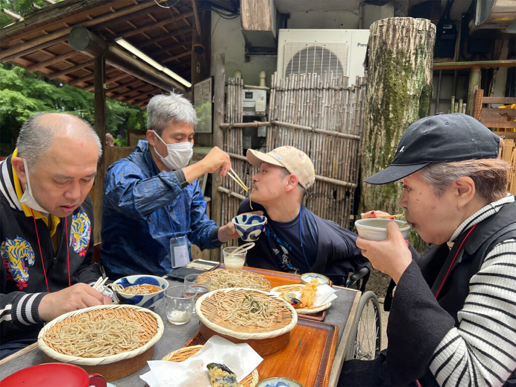 深大寺は、観光の名所でお蕎麦が有名ということもあり、11:00にはお店の前には既に小さな列ができており、行列は時間の問題と察して先ずは玉乃屋さんのお蕎麦でエネルギーを吸収。その後、元三大師堂での参拝を目指し、急な坂道を後ろ向きに降ります、車椅子が重く足を踏ん張る力が無いと難しい、という感じです。